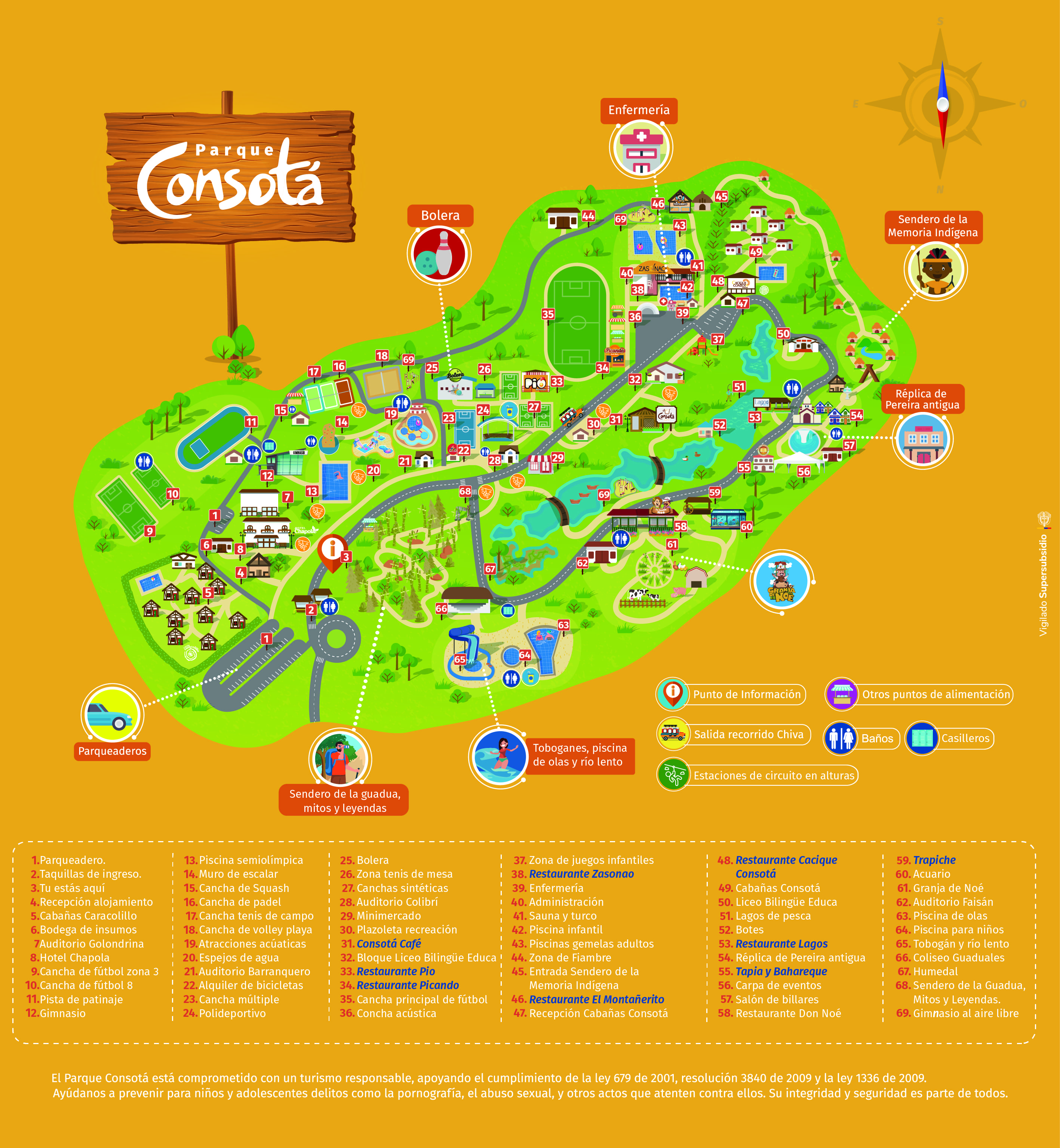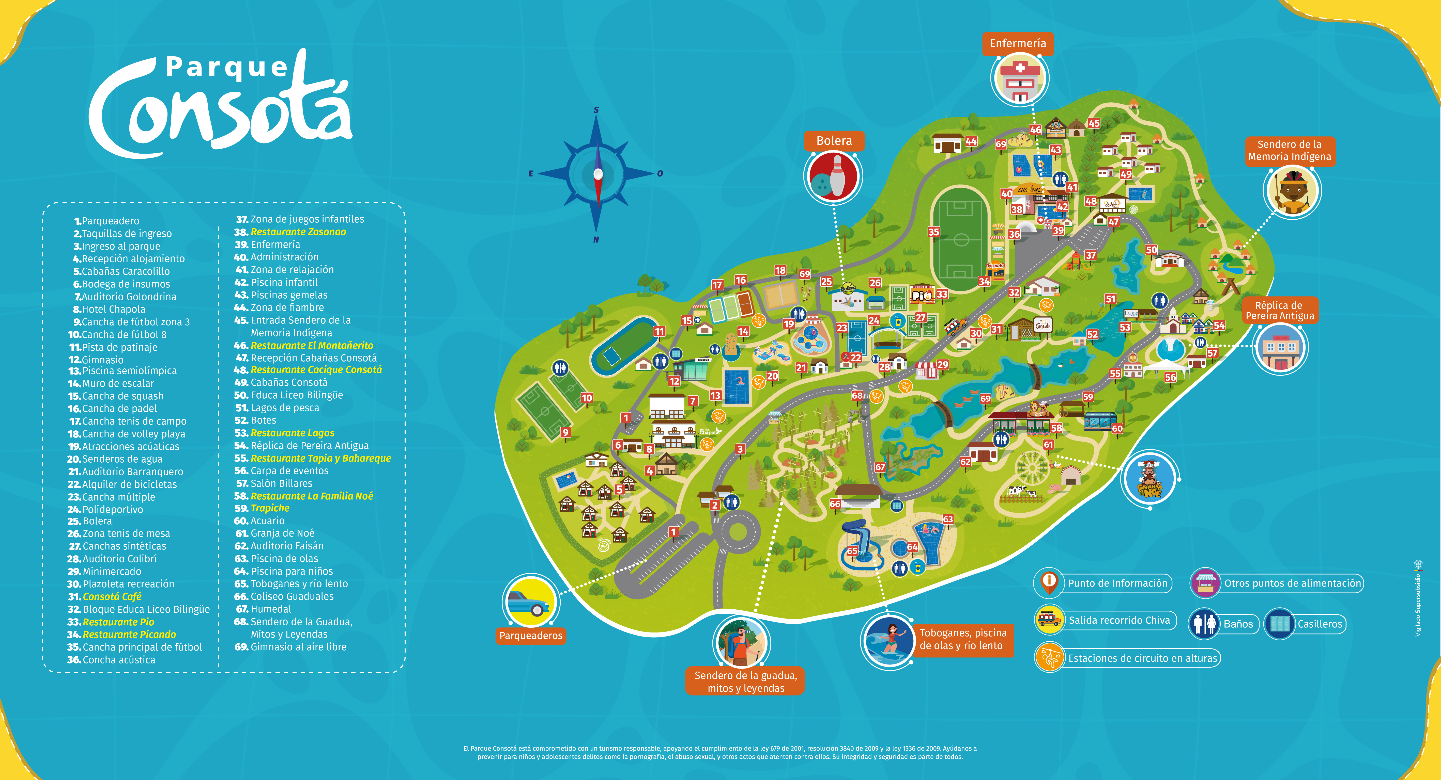 Piscina de olas, piscinas de niños, piscinas gemelas, recorrido en chiva, ingreso sendero de la Memoria indígena, ingreso sendero Mitos y Leyendas, ingreso a La Granja de Noé y todas las actividades recreativas que se realicen dentro del Parque Consotá.