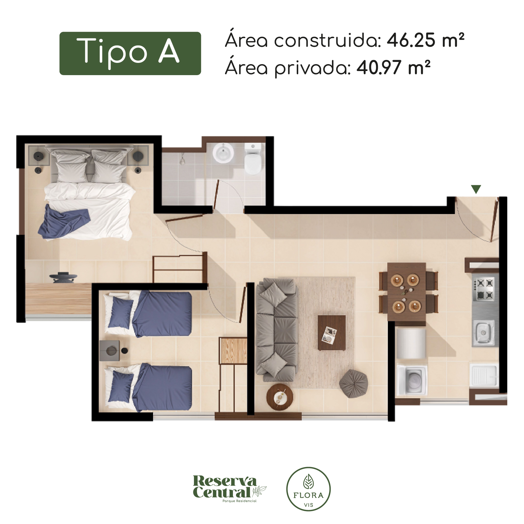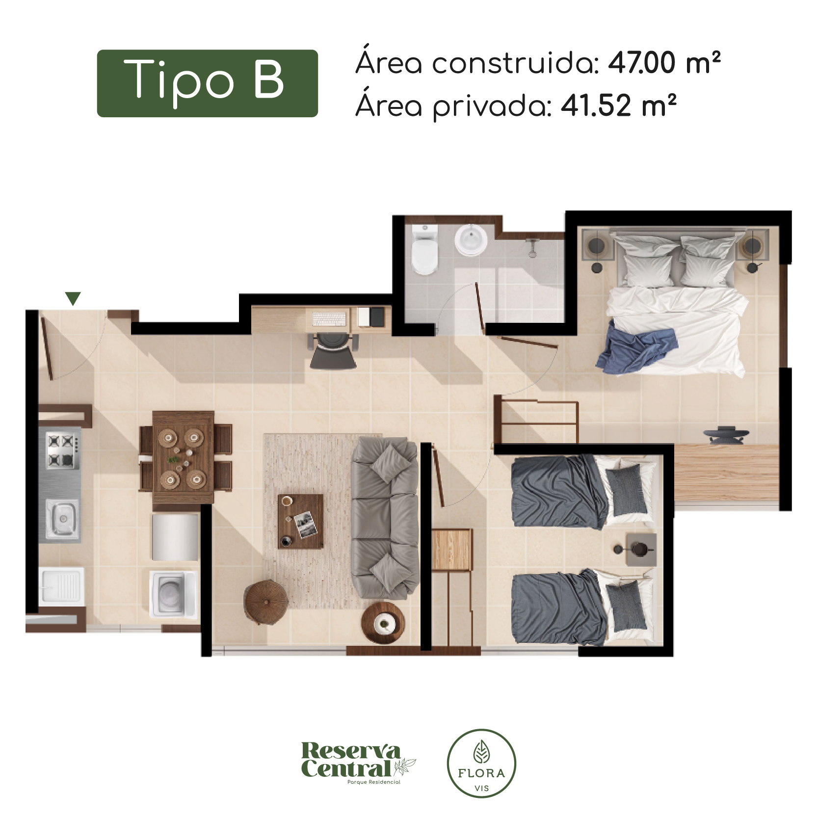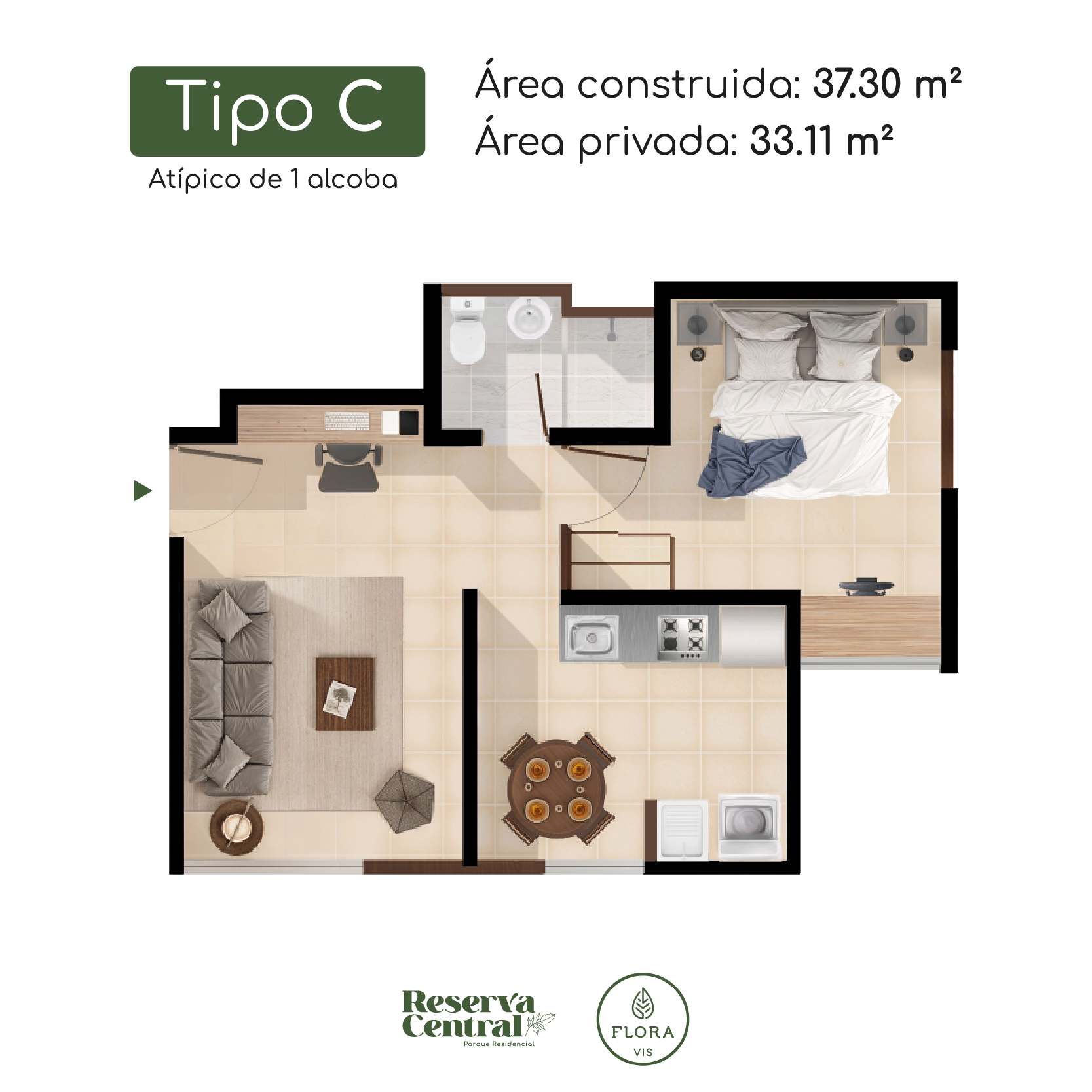 37.30m² - 47.00m² Área privada: 33.11m² - 41.52m²