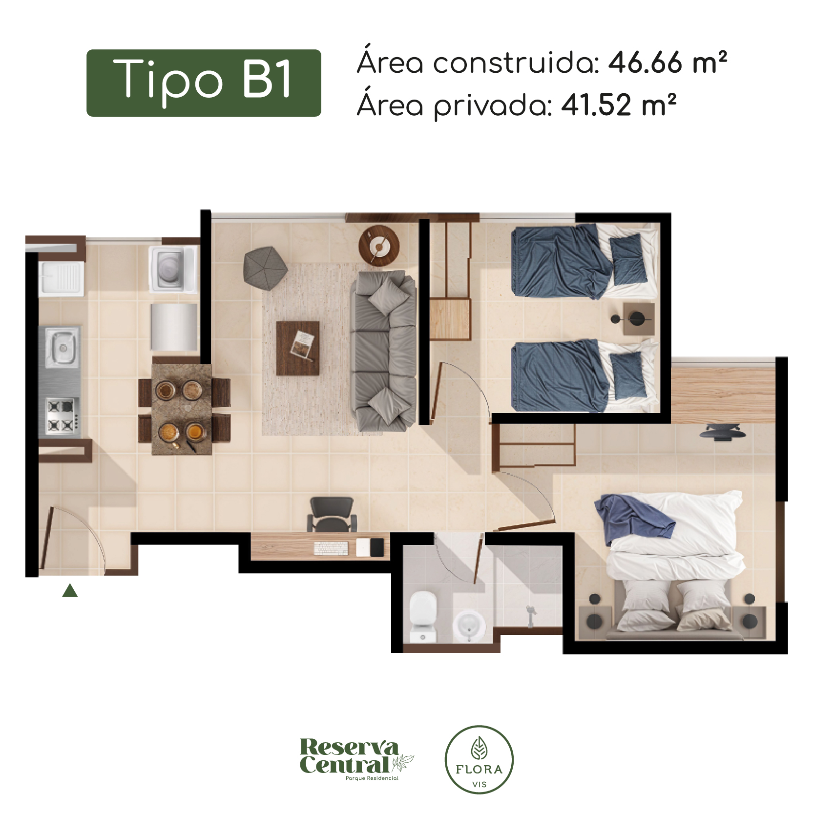 2. Los planos y renders contenidos en la publicidad son una representación digital del diseño y pueden variar respecto al producto final entregado. Los precios se fijan según áreas aproximadas, ubicación, disponibilidad, política comercial y pueden variar en cualquier momento. Los muebles, enseres y acabados, utilizados en el apartamento modelo y/o en los renders de la publicidad, son elementos de decoración que no hacen parte del apartamento.