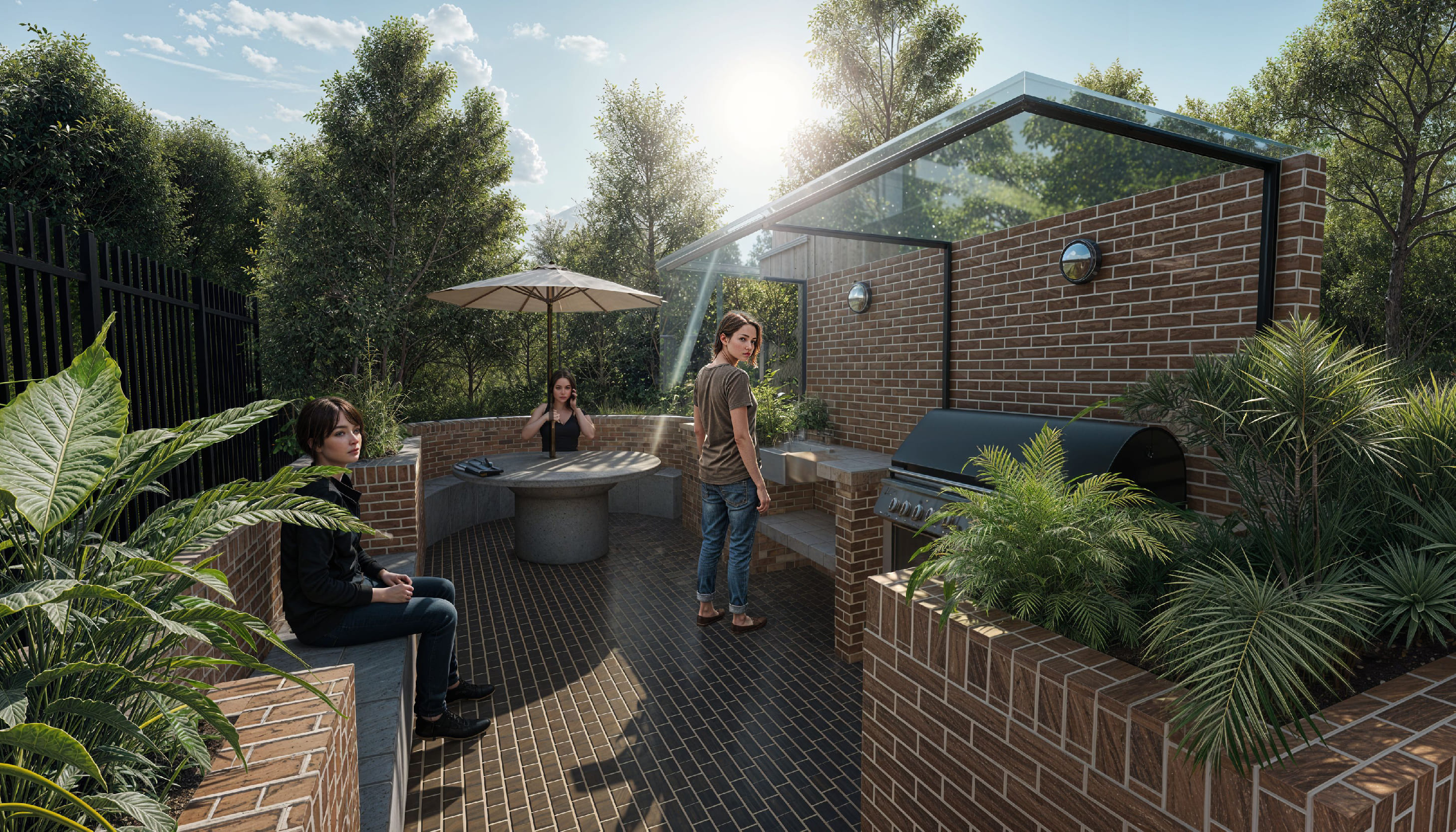 Los modernos edificios de apartamentos de Villabosque Nativo, con grandes ventanales y balcones al atardecer, dan a zonas de juego cubiertas de hierba, donde los niños ríen y les espera un parque para perros con túneles y aros. Varios coches aparcan delante de las elegantes residencias.